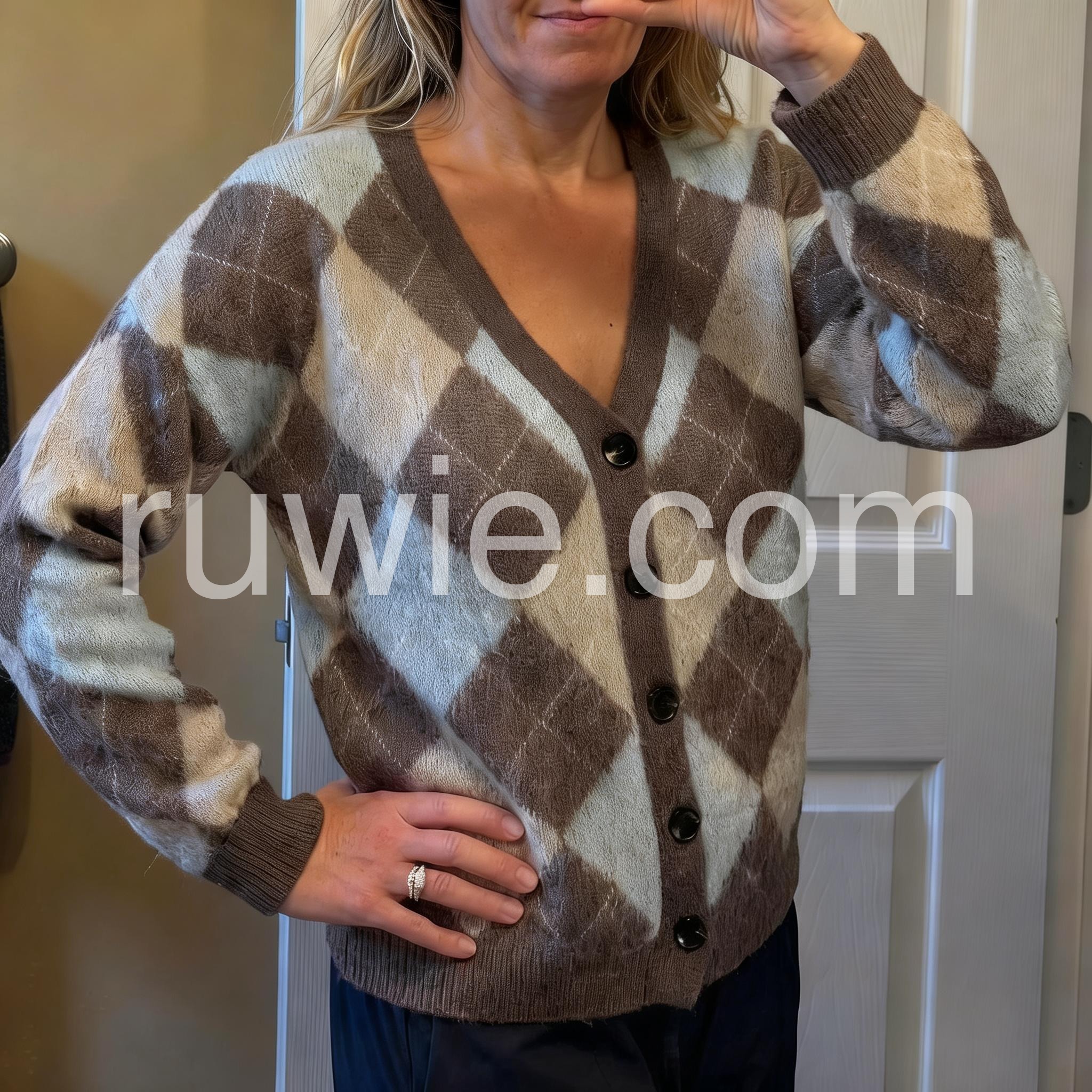 This cardigan features a timeless argyle geometric print in versatile neutral tones, offering a sophisticated layering option. Crafted with a button-front design, it allows easy wear and adjustable styling. Its refined pattern blends classic and contemporary elements, making it an ideal choice for enhancing both casual and polished outfits with subtle texture and depth.
