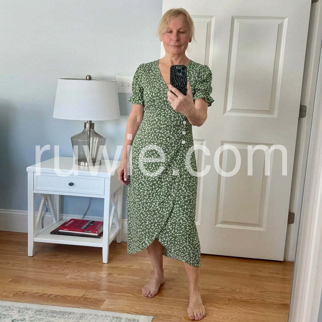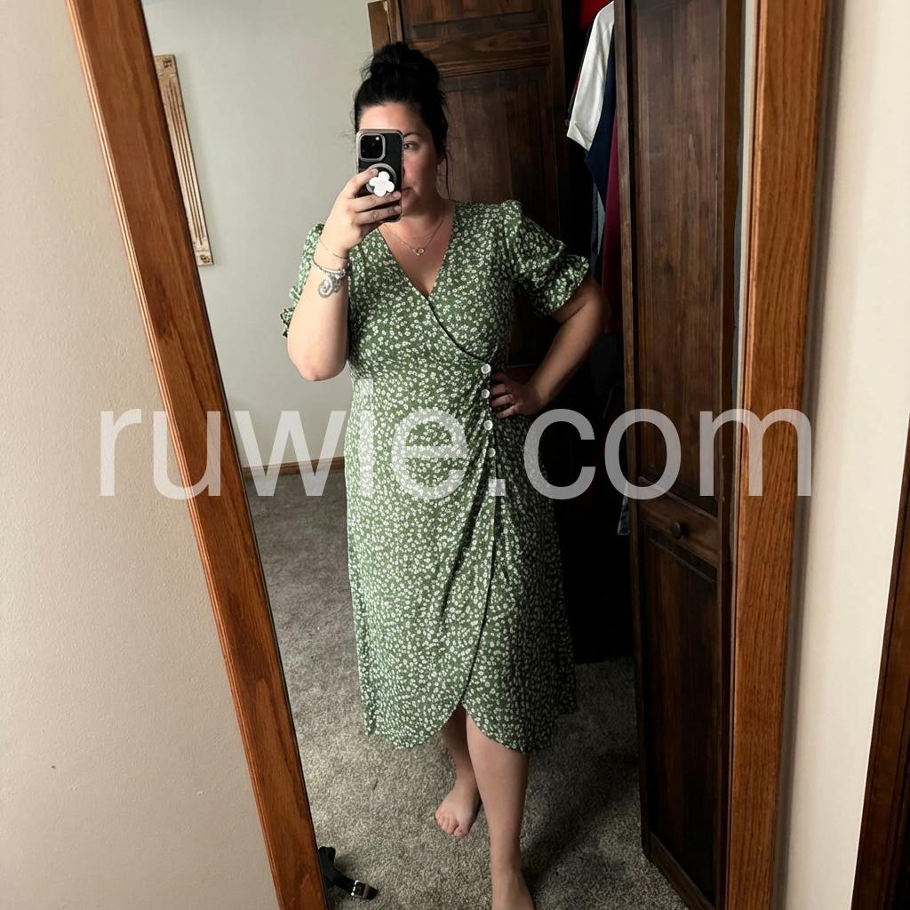 I absolutely love this dress! The green color is so vibrant and the floral print is perfect for spring. The faux wrap style is super flattering on my figure, hiding my tummy area perfectly. Highly recommend!