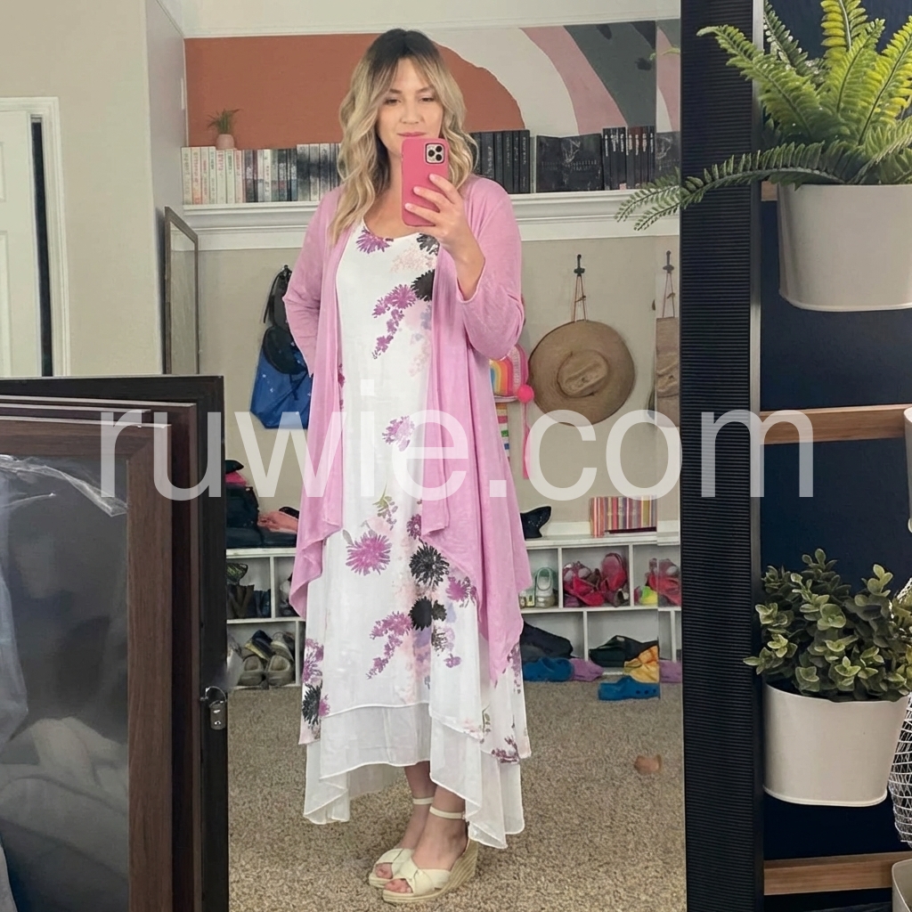 Absolutely love this dress set! The purple cardigan pairs perfectly with the floral dress. It is incredibly lightweight and flowy, making it ideal for summer weddings. I received so many compliments.