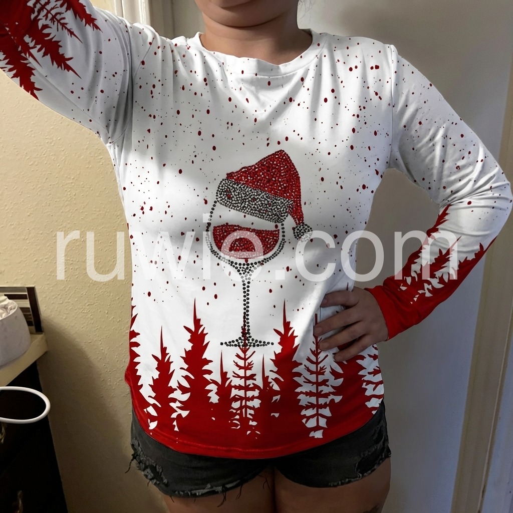 Bottoms up with this vibrant Christmas top featuring a sparkling printed tipsy red wine glass and Santa hat, making it perfect for wearing to any holiday party. Spread the cheer near and dear with red pine trees/Christmas trees in a silhouette, accentuating this super-cute design. Long sleeves and a waist-length fit keep you cozy.